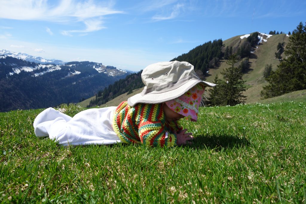 We had already learned that walking on exciting paths does not fit together with with using prams. But we still very much liked the idea of a real mountain hike, soon after the birth of our daughter. So we tried the obvious: a sling (in fact, this is exactly the one, except for that we use the version without “ring”. We’ve been using it outdoors and indoors with pleasure for four years now)! At home, this had already worked well, our baby has almost always felt comfortable in the sling from the beginning. So now that spring had just arrived, we urgently needed to try its first outdoor use out in the mountains!